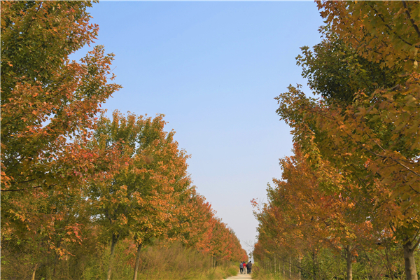 霜降過后,層林盡染。商水縣張明鄉(xiāng)炎坤種植合作社千畝苗圃里的紅葉石楠、五角楓、紅冠紅楓、法桐等數(shù)十種苗木葉子開始變得斑斕多彩,和路邊野蒿、地上的草坪、天上潔白的云朵形成豐富的景觀層次,吸引了周邊大批游客前來游玩賞秋。