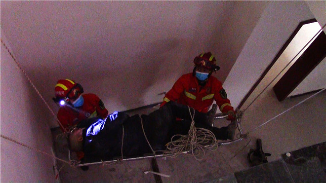 了解情況后,4名消防員立即深入地下室,利用擔(dān)架,先將老人保持原有姿勢轉(zhuǎn)移到擔(dān)架上,再用救援繩將老人綁在擔(dān)架上加以固定。最后,救援人員將擔(dān)架四角分別綁上救援繩,下方人員托扶擔(dān)架,上方人員將擔(dān)架平穩(wěn)的向上拉。經(jīng)過近30分鐘緊張救援,成功將被困老人救出,并交由醫(yī)護(hù)人員進(jìn)行下一步處理。②10