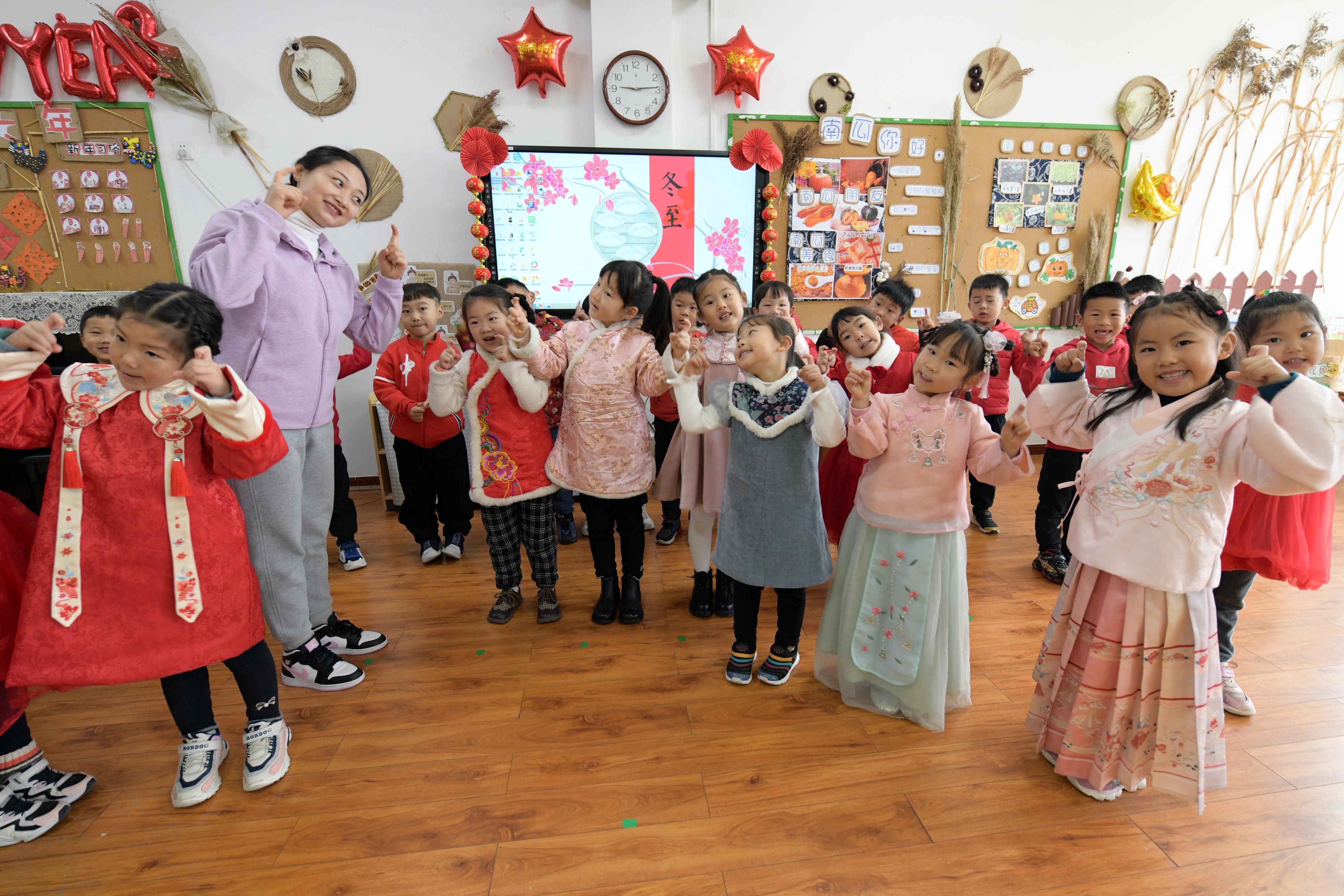 小朋友在老師的指導下學唱冬至數(shù)九歌。