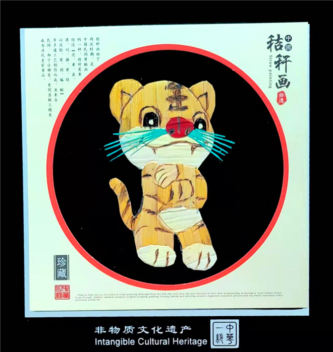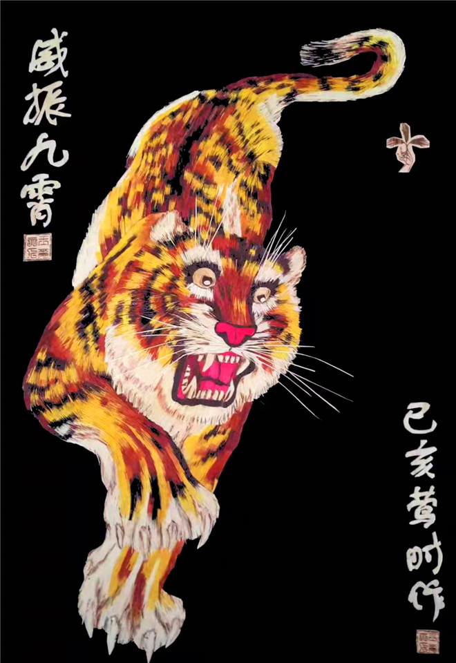 為了慶祝虎年,王春梅創(chuàng)作的秸稈畫主要有《威震九霄》《虎之王者》《飛天神虎》等,此外,她還創(chuàng)作了兩幅剪紙作品,分別是《虎年組圖》和《虎之2022》。和剪紙作品相比,秸稈畫制作工序更加復(fù)雜,全憑手工完成,充分利用秸稈本身的紋理和質(zhì)地,結(jié)合顏色、溫度的變化,將畫面立體的呈現(xiàn)出來。其中,她創(chuàng)作的部分作品結(jié)合了唐卡的相關(guān)風(fēng)格和顏色配比,比如《威震九霄》中虎的形象所表現(xiàn)出來的力量感借鑒了唐卡中護(hù)法的力量感;《虎之王者》和《虎之2022》中對于藍(lán)色的運(yùn)用結(jié)合了唐卡中的藍(lán)色,代表了永恒不變,如同穹蒼攬護(hù)萬物之意。