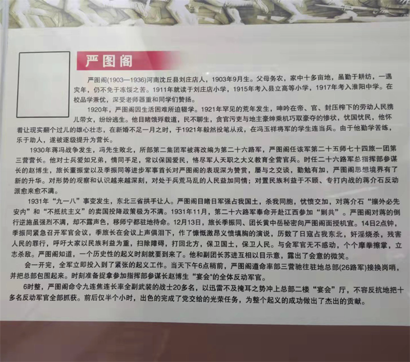 嚴(yán)圖閣出生于1903年,河南省沈丘縣人。1911年,嚴(yán)圖閣被父親送進(jìn)劉莊店小學(xué)讀書,1915年考入縣立高等小學(xué),1917年投考淮陽中學(xué)被錄取。他刻苦讀書,成績優(yōu)異,深得老師和同學(xué)們的贊揚。1921年,他毅然背井離鄉(xiāng),外出從軍。1930年,嚴(yán)圖閣任國民革命軍第二十六路軍一團三營營長。1931年12月,參加著名的寧都起義,成為中國共產(chǎn)黨領(lǐng)導(dǎo)的革命隊伍中的一員。寧都起義后,嚴(yán)圖閣所在部隊改編為紅軍第五軍團,由于其驍勇善戰(zhàn),累積戰(zhàn)功,被任命為第十六師參謀長。1932年,嚴(yán)圖閣正式加入中國共產(chǎn)黨。1935年在湖北一場戰(zhàn)斗中身負(fù)重傷,后轉(zhuǎn)移至湖南省平江縣治療。1936年3月,嚴(yán)圖閣奉命擔(dān)任湘鄂贛省軍區(qū)司令員職務(wù),進(jìn)行游擊戰(zhàn)爭,為保衛(wèi)湘鄂贛革命根據(jù)地作出了貢獻(xiàn)。1936年11月,嚴(yán)圖閣因病不幸去世。