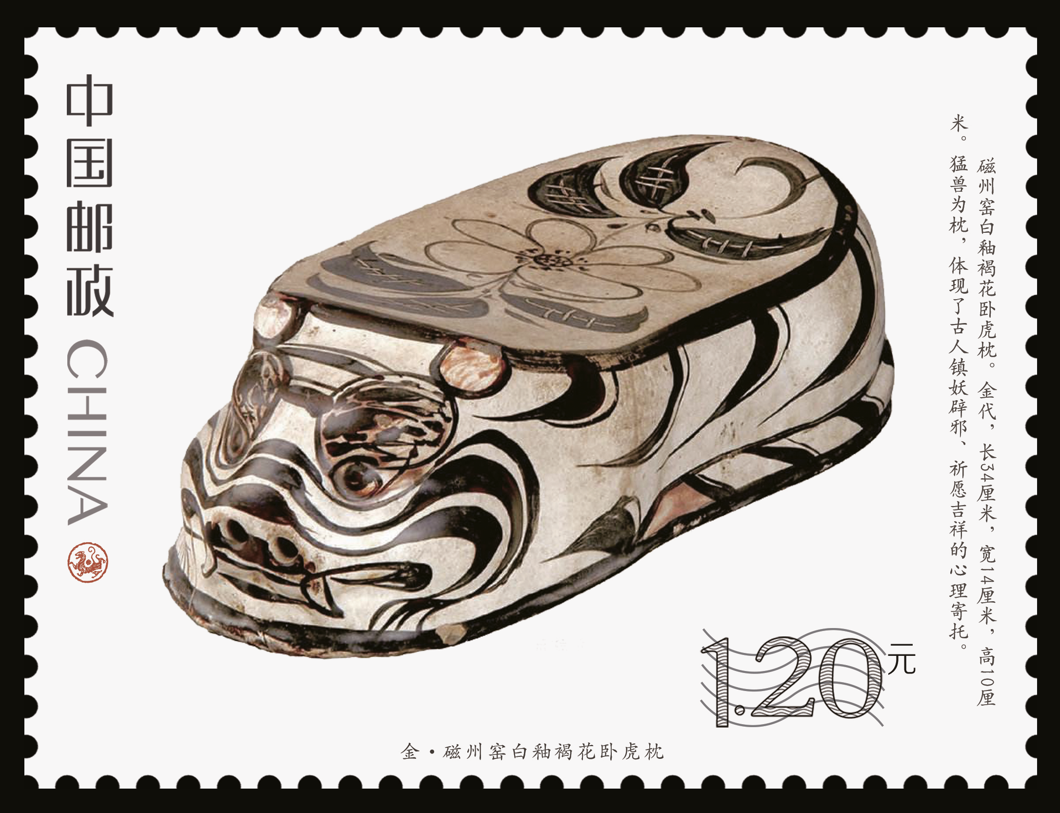 9月5日,由中國(guó)郵政特別制作的《虎文物》特種郵票正式發(fā)行。此套郵票共有6枚,每枚上都印有一件珍貴的虎文物。郵票圖案名稱分別為“商·伏鳥雙尾青銅虎”“春秋·青玉虎形佩”“漢·白虎瓦當(dāng)”“漢·錯(cuò)金銘文銅虎節(jié)”“金·磁州窯白釉褐花臥虎枕”“清·皮影飛虎”。其中第五枚郵票圖案中的“金·磁州窯白釉褐花臥虎枕”就是來(lái)自周口市博物館的珍貴文物。