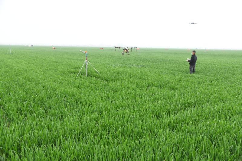 圖為商水縣高標準農(nóng)田示范區(qū)內(nèi),技術(shù)人員在操作植保無人機噴灑農(nóng)藥。