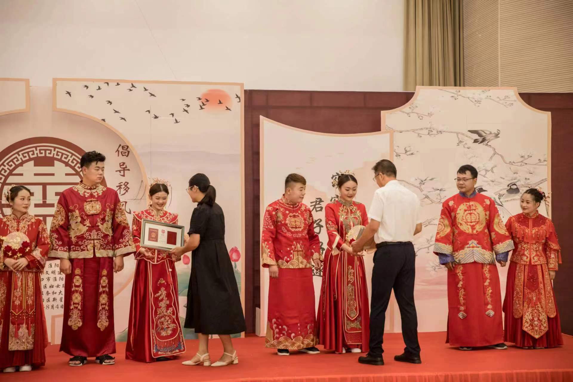 7對(duì)新人在親朋好友們的見證與祝福中,攜手走上紅地毯,步入婚姻的殿堂。現(xiàn)場(chǎng),區(qū)民政局等有關(guān)部門負(fù)責(zé)同志為新人們送上了精美禮品,祝福他們未來的生活幸福甜蜜。