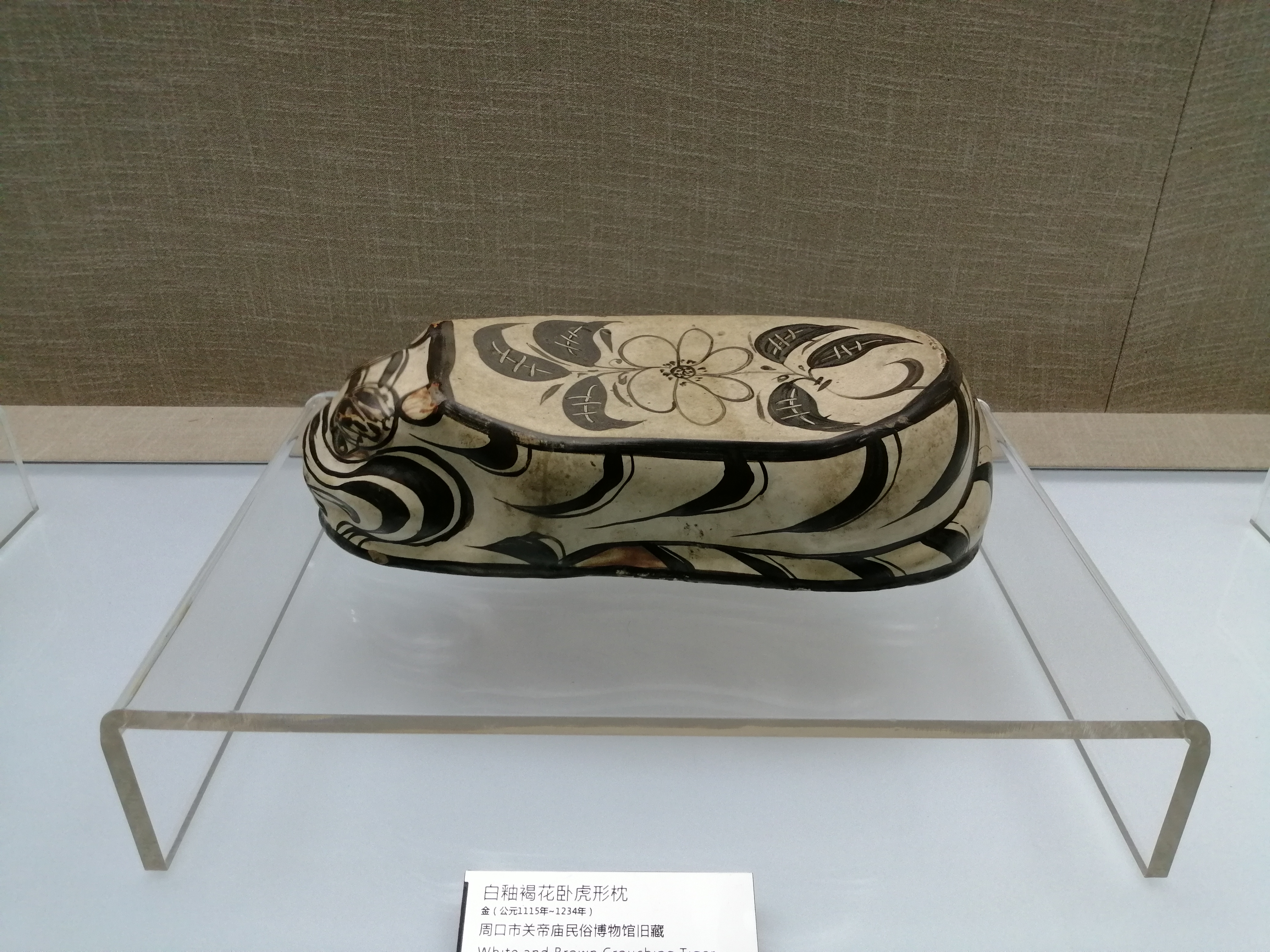 據(jù)市博物館工作人員介紹,這件館藏金代磁州窯白釉褐花臥虎枕是1978年7月商水縣練集鄉(xiāng)農(nóng)民在翻土?xí)r發(fā)現(xiàn)的。長34厘米,寬14厘米,高10厘米。枕體呈臥虎狀,枕面為腰圓形,前高后低,大平底。整器以虎身為枕身,以黑彩繪出虎頭形象和虎身條狀斑紋,虎鼻為兩氣孔。以虎背作枕面,其上以黑彩繪折枝花卉,枝葉上飾“豐”字紋葉脈,花朵勾勒流暢,花蕊清晰可見。此枕將虎的溫馴的狀態(tài)及折枝花卉和諧地組合在一起,形象生動活潑,情趣盎然,體現(xiàn)了工匠豐富的想象力。據(jù)說枕以虎等猛獸為造型,可鎮(zhèn)妖避邪、早得貴子。