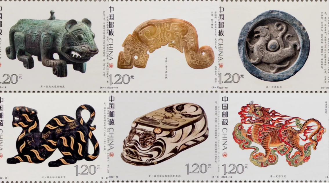 9月5日,由中國郵政特別制作的《虎文物》特種郵票正式發(fā)行。此套郵票共有6枚,每枚上都印有一件珍貴的虎文物。郵票圖案名稱分別為“商·伏鳥雙尾青銅虎”“春秋·青玉虎形佩”“漢·白虎瓦當”“漢·錯金銘文銅虎節(jié)”“金·磁州窯白釉褐花臥虎枕”“清·皮影飛虎”。其中第五枚郵票圖案中的“金·磁州窯白釉褐花臥虎枕”就是來自周口市博物館的珍貴文物,該郵票運用光油和浮雕擊凸工藝,塑造了虎安詳、可愛的形象。