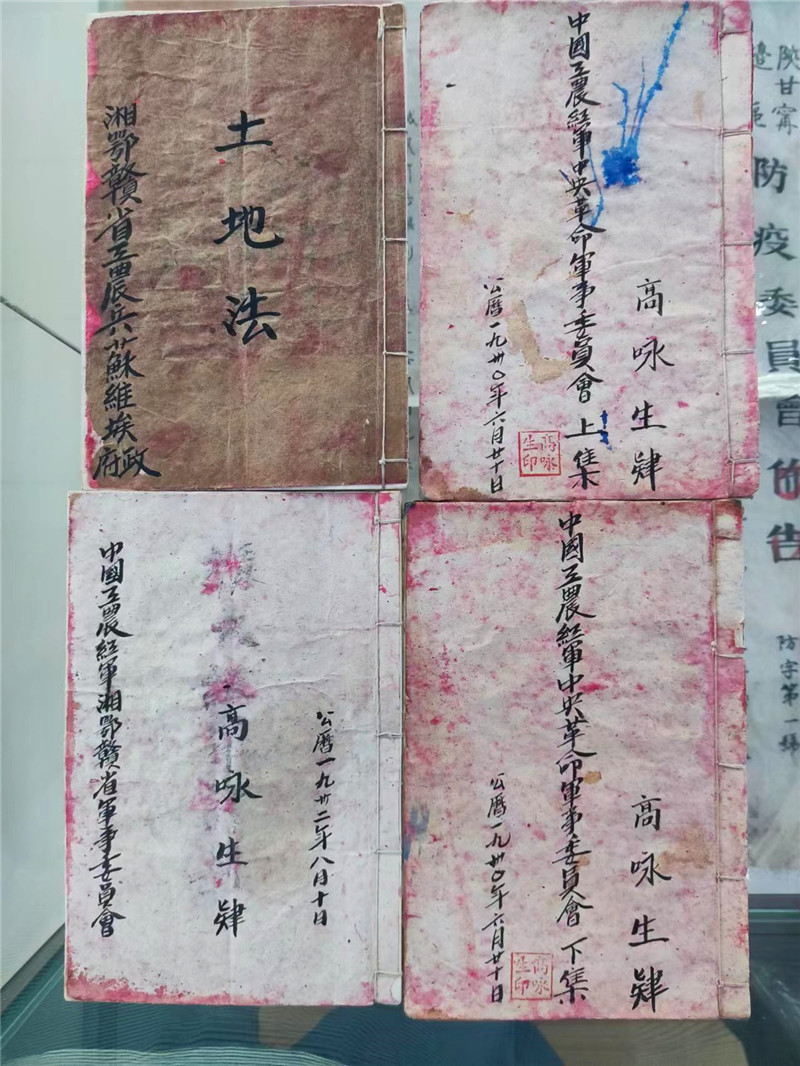 李洪東收藏的高詠生手寫筆記共有四本,包括高詠生用毛筆抄寫的公文《中國工農(nóng)紅軍中央革命軍事委員會》文件上集和下集、《湘鄂贛省工農(nóng)兵蘇維埃政府土地法》、1932年書寫的文件《目前擴(kuò)大紅軍的計(jì)劃大綱》。文件上面都有“高詠生肄”幾個字,蓋“高詠生印”大紅印章。