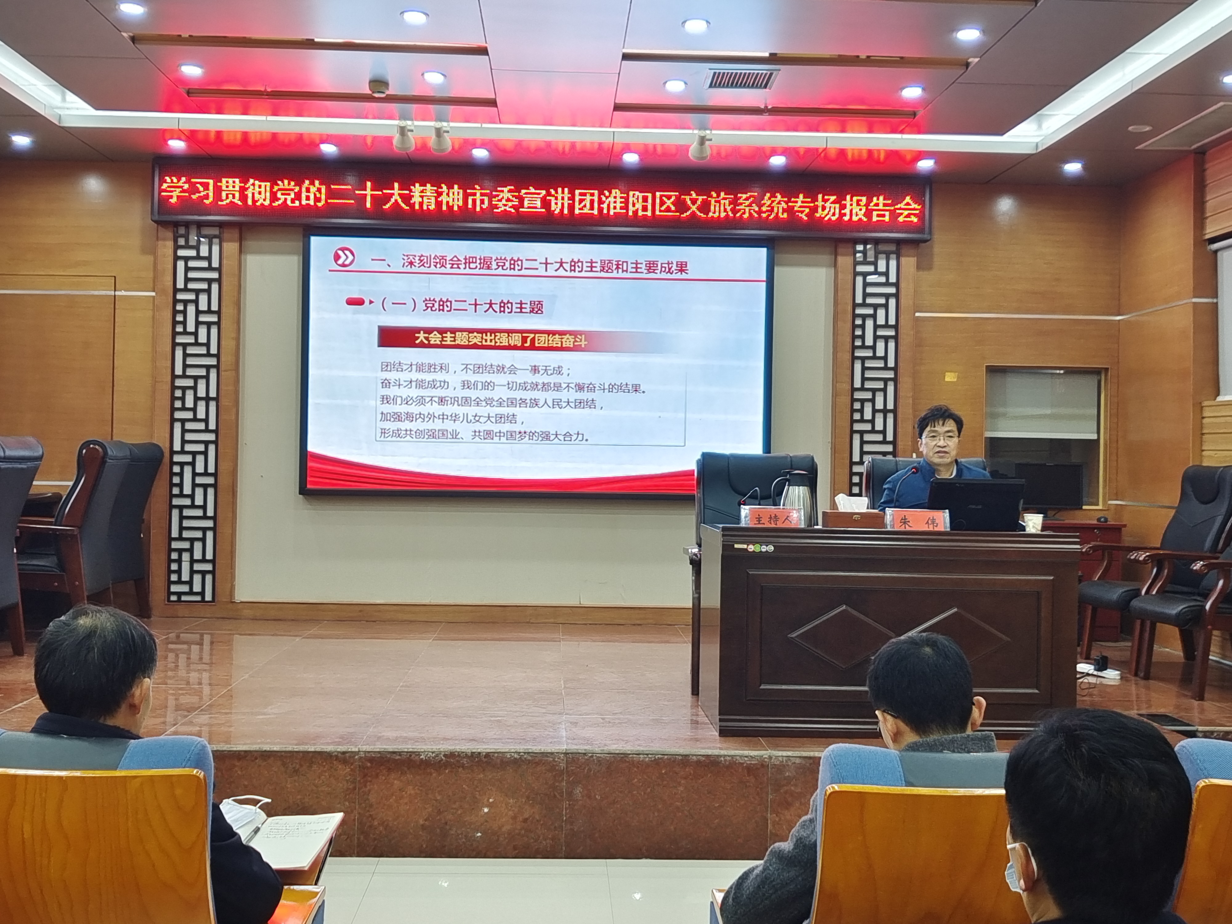 11月29日下午,周口市委宣講團成員,市文化廣電和旅游局黨組成員、副局長朱偉走進太昊陵景區(qū),向淮陽區(qū)廣大文旅干部職工、游客宣講黨的二十大精神。