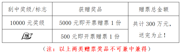 活動(dòng)期間,購(gòu)彩者在河南省范圍內(nèi)任一體彩銷售實(shí)體店購(gòu)買指定活動(dòng)票種,若單張彩票刮中符合獎(jiǎng)勵(lì)條件的獎(jiǎng)級(jí)或標(biāo)志,經(jīng)實(shí)體店終端兌獎(jiǎng)設(shè)備成功完成獎(jiǎng)金兌付及促銷兌獎(jiǎng)掃描后,即可獲得即開票贈(zèng)票獎(jiǎng)品一份??傤~有限,送完為止,詳見(jiàn)下表: