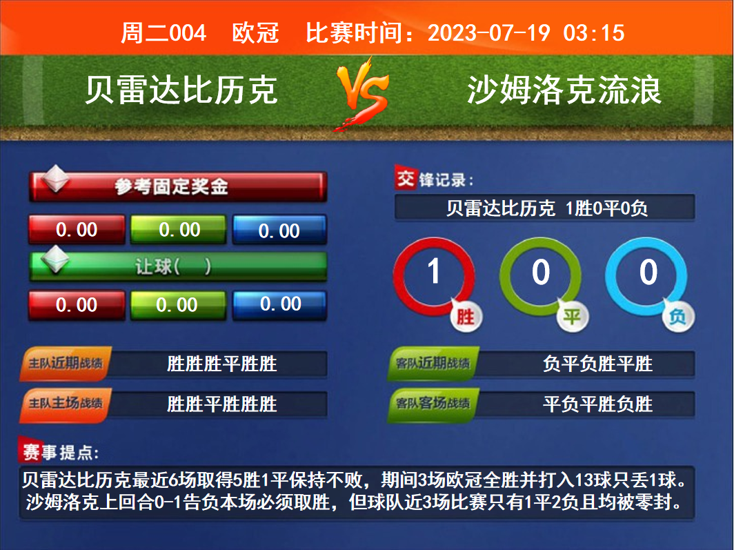 比賽時(shí)間:2023-07-19 03:15賽事提點(diǎn):貝雷達(dá)比歷克最近6場(chǎng)取得5勝1平保持不敗,期間3場(chǎng)歐冠全勝并打入13球只丟1球。沙姆洛克上回合0-1告負(fù)本場(chǎng)必須取勝,但球隊(duì)近3場(chǎng)比賽只有1平2負(fù)且均被零封。