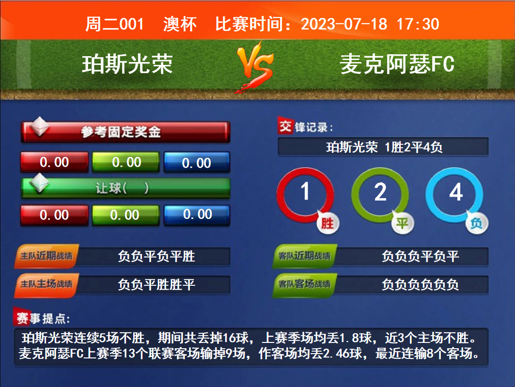 比賽時(shí)間:2023-07-18 17:30賽事提點(diǎn):珀斯光榮連續(xù)5場(chǎng)不勝,期間共丟掉16球,上賽季場(chǎng)均丟1.8球,近3個(gè)主場(chǎng)不勝。麥克阿瑟FC上賽季13個(gè)聯(lián)賽客場(chǎng)輸?shù)?場(chǎng),作客場(chǎng)均丟2.46球,最近連輸8個(gè)客場(chǎng)。