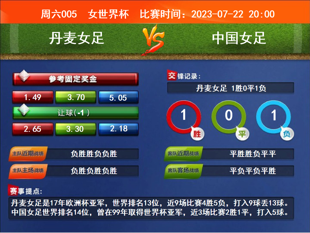 比賽時(shí)間:2023-07-22 20:00賽事提點(diǎn):丹麥女足是17年歐洲杯亞軍,世界排名13位,近9場(chǎng)比賽4勝5負(fù),打入9球丟13球。中國(guó)女足世界排名14位,曾在99年取得世界杯亞軍,近3場(chǎng)比賽2勝1平,打入5球。