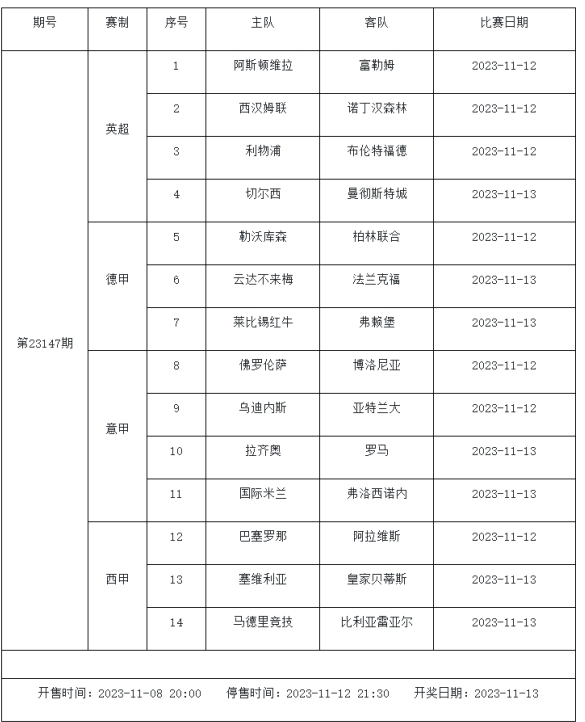 足球彩票勝負(fù)游戲(14場(chǎng)和任選9場(chǎng))第23147期賽程:
