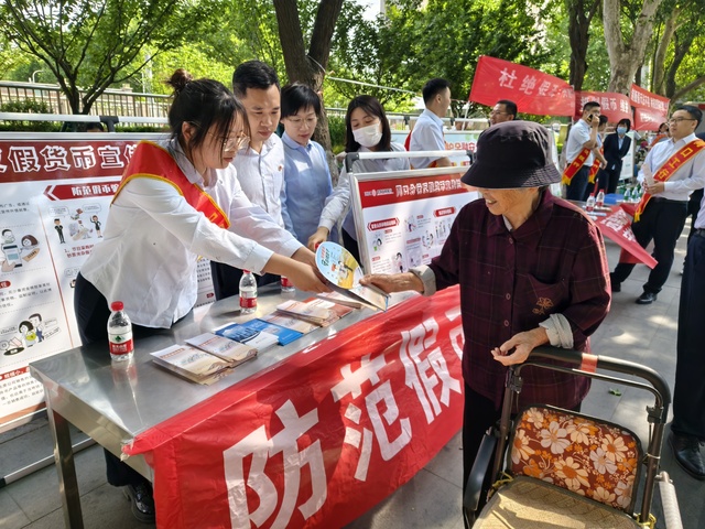 活動當天,該行組織員工前往五一廣場開展集中宣傳,通過設置宣傳咨詢臺,懸掛橫幅,向群眾發(fā)放反假幣、愛護人民幣和打擊假幣犯罪宣傳折頁,普及數字人民幣知識,宣傳人民幣防偽知識和識別假幣騙局,傳遞“防范假幣,保護自我”理念。針對老年客戶風險意識和識假能力不足問題,該行開展“一對一,手把手”現(xiàn)場教授假幣“看、摸、聽、測”等識別方法,切實守牢老年客戶的“錢袋子”。