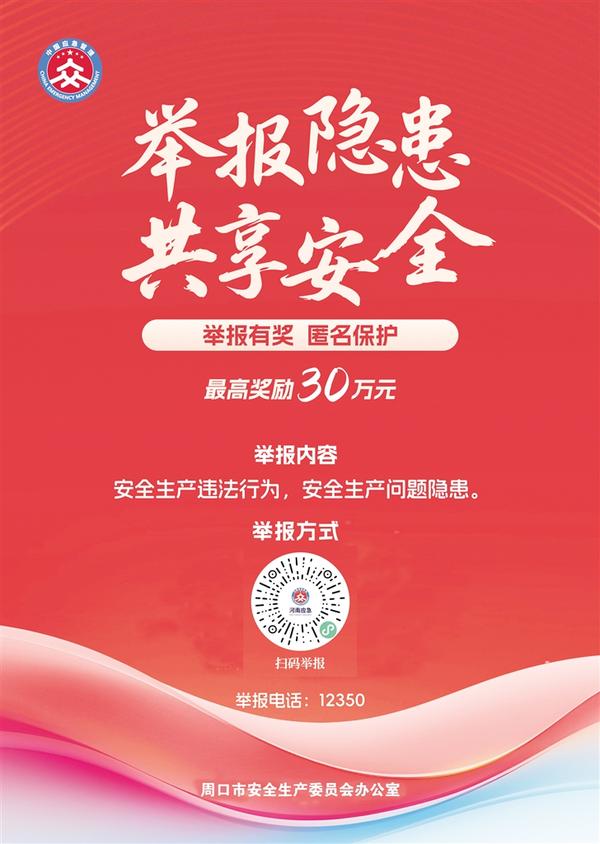 周口市安全生產(chǎn)委員會(huì)辦公室以舉報(bào)電話(huà)、掃碼舉報(bào)等方式,受理群眾舉報(bào)安全生產(chǎn)非法違法行為線(xiàn)索。一經(jīng)查實(shí),我們將依據(jù)《河南省安全生產(chǎn)領(lǐng)域舉報(bào)獎(jiǎng)勵(lì)實(shí)施辦法》相關(guān)規(guī)定,對(duì)舉報(bào)人予以獎(jiǎng)勵(lì),最高獎(jiǎng)勵(lì)金額30萬(wàn)元。我們將對(duì)舉報(bào)人個(gè)人信息進(jìn)行嚴(yán)格保密,依法保護(hù)舉報(bào)人的合法權(quán)益。