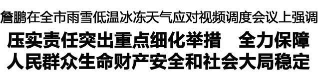 本報訊 (記者 李鳳霞) 1月18日,市長詹鵬主持召開全市雨雪低溫冰凍天氣應對視頻調(diào)度會議,強調(diào)要深入學習貫徹習近平總書記關于防災減災救災的重要指示精神,貫徹落實省委和市委決策部署,以“時時放心不下”的責任感,扎實有效應對雨雪低溫冰凍天氣,確保人民群眾生命財產(chǎn)安全和社會大局和諧穩(wěn)定??钻?、朱向陽、張建黨、程若光、王文峰出席會議。