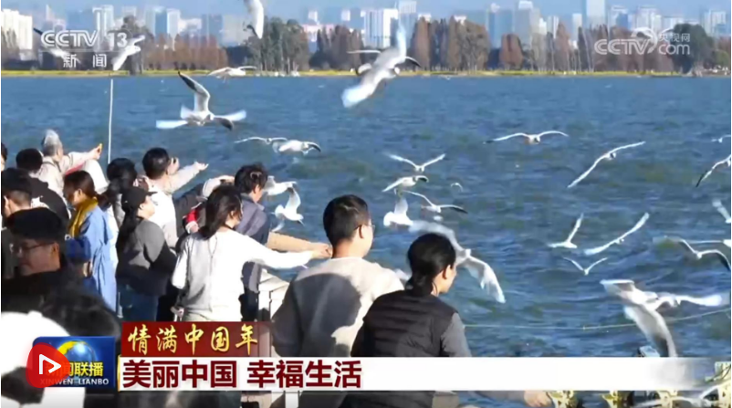 春節(jié)假期,云南昆明滇池沙鷗翔集、碧波蕩漾,在緊鄰滇池的福保社區(qū),人們跳起民族舞蹈,喜迎八方來客,共賞滇池生態(tài)美景。