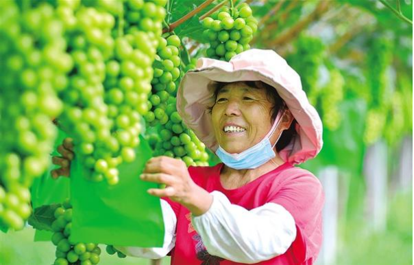 日前,位于鄲城縣錢店鎮(zhèn)的尚葡農(nóng)業(yè)科技園內(nèi)碩果累累,精細(xì)化管理帶來葡萄大豐收。圖為一名工作人員看著即將收獲的葡萄笑逐顏開。
