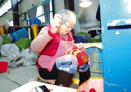 冬日清晨,鄲城縣汲冢鎮(zhèn)謝寨行政村吉特體育用品車間里,陽光穿過廠房玻璃窗,落在72歲周桂英老人布滿老繭的手上。周桂英正專注進行著足球縫制的最后一道工序——封口,只見她雙手各執(zhí)一針,左手進、右手出,紅色棉線在紅白相間的足球表面快速穿梭。飛針走線間,一場指尖上的“魔術(shù)”正在上演。
