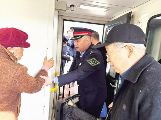 11月22日,由周口開(kāi)往上海的K1505次列車??宽?xiàng)城站時(shí),列車長(zhǎng)潘玉龍?jiān)谡九_(tái)發(fā)現(xiàn)一位乘坐輪椅的旅客李女士,便主動(dòng)上前提供幫助。