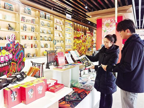 12月18日,在太昊伏羲陵文化旅游區(qū)旅游產(chǎn)品展廳,游客在欣賞非遺手工產(chǎn)品。近年來,太昊伏羲始祖旅游區(qū)運(yùn)營管理有限公司為豐富游客體驗(yàn),聚焦非遺手工、潮玩手辦等主題,開發(fā)了近百個(gè)旅游新產(chǎn)品,以滿足游客多元化需求。