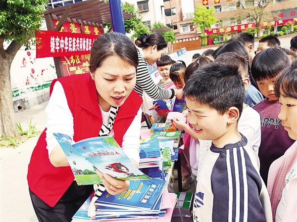 4月9日,志愿者向?qū)W生講解反邪教知識。當天,扶溝縣科協(xié)聯(lián)合縣委統(tǒng)戰(zhàn)部、縣民宗局、縣教體局開展“鑄牢中華民族共同體意識暨民族宗教政策法規(guī)宣傳月”活動,為回族小學(xué)師生送去科普圖書及宣傳物品2000余件。