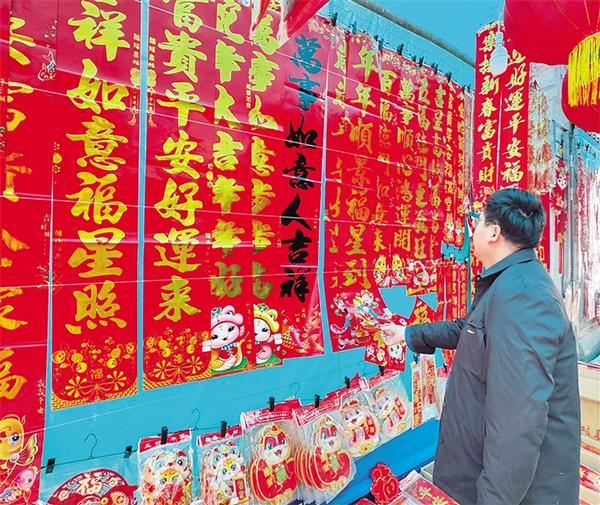 1月11日,市民在挑選對聯(lián)。當(dāng)日,記者在中心城區(qū)走訪時看到,琳瑯滿目的春節(jié)飾品已火熱上市,不少商家把一個個大紅燈籠高高掛起,市民采購年畫、福字、對聯(lián)、窗花、中國結(jié)等春節(jié)飾品,“囤貨”迎春節(jié)。