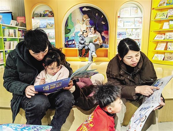 昨日, 市民帶著孩子在市新華書店內(nèi)讀書。孩子們或聚精會神地看書,或認(rèn)真聽家長講故事,在書香的陪伴下度過了有意義的一天。