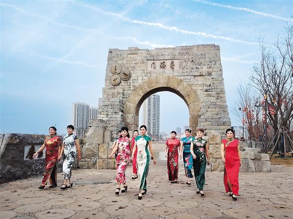 1月14日,身著各色旗袍的模特冒著嚴(yán)寒在南寨歷史文化街區(qū)普濟門前進(jìn)行模特走秀表演,為冬日的城區(qū)增添了一抹亮麗色彩。