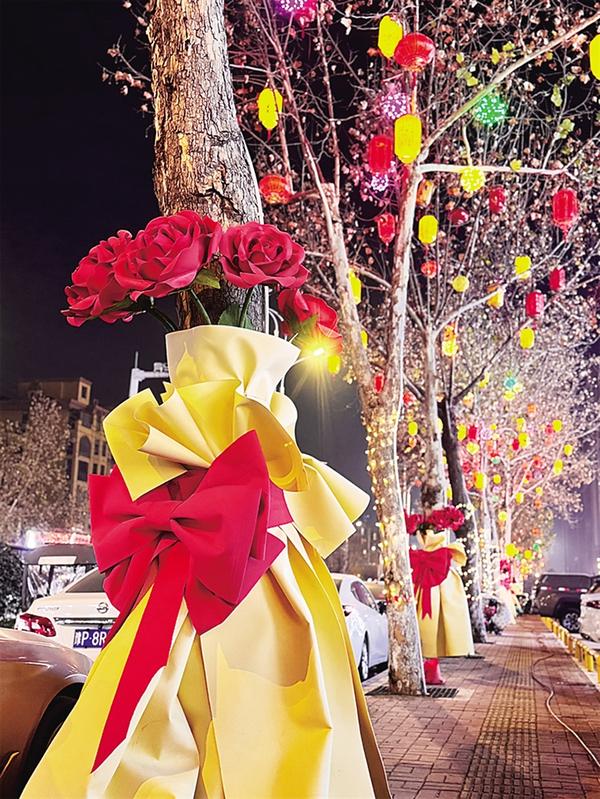 1月15日,記者在慶豐中路(勝利街至西六路段)看到,經(jīng)過精心布置,行道樹搖身一變成為巨型“玫瑰花束”,仿佛是精心準(zhǔn)備的城市禮物。