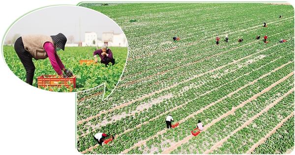 近年來,我市積極推廣“合作社+農(nóng)戶”“家庭農(nóng)場+農(nóng)戶”經(jīng)營模式,鼓勵農(nóng)民通過土地流轉(zhuǎn)將分散耕地整合起來,實現(xiàn)集中化、規(guī)?;?jīng)營,全力提高土地利用效率,為鄉(xiāng)村振興注入強(qiáng)勁動力。圖為4月11日,在淮陽區(qū)王店街道范莊行政村的農(nóng)田里,村民正采收蔬菜。