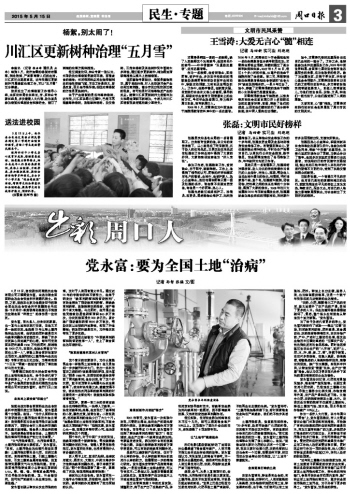 “近年來土壤酸化板結(jié)速度加快,所有土地遭受不同程度的農(nóng)資次生災(zāi)害。建議各級黨委和政府及有關(guān)部門應(yīng)盡早重視土地污染治理工作,牽頭組織相關(guān)部門,爭取盡快在全市范圍內(nèi)宣傳、推廣和應(yīng)用土地污染治理技術(shù),逐步向全國受污染的土地開戰(zhàn),為子孫留下更多的凈土。”黨永富說,這是他的夢想。