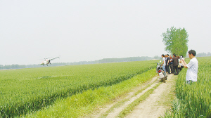 5月7日,一架小型直升機(jī)為小麥噴灑農(nóng)藥。當(dāng)前,正是小麥 “一噴三防”的關(guān)鍵時(shí)期,項(xiàng)城市三店鎮(zhèn)多方聯(lián)系,引進(jìn)小型直升機(jī)為小麥高產(chǎn)示范田噴灑農(nóng)藥,為豐產(chǎn)豐收奠定良好基礎(chǔ)。董方靈 攝