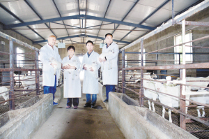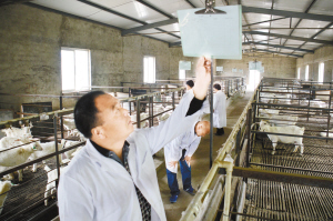 孫振偉原是當(dāng)?shù)刂那嗄昶髽I(yè)家,2008年初被西關(guān)村居民高票選舉為村黨支部書記,憑著對家鄉(xiāng)的強(qiáng)烈責(zé)任感和保護(hù)槐山羊特色品種的使命感,孫振偉帶領(lǐng)西關(guān)村立足本村作為槐山羊傳統(tǒng)養(yǎng)殖區(qū)的優(yōu)勢,于2010年成立沈丘縣槐山羊養(yǎng)殖發(fā)展有限公司,在省畜牧展交易會(huì)上,與鄭州鄭源公司合作,共同簽約了投資6000萬元建設(shè)槐山羊原種保護(hù)、繁育、深加工項(xiàng)目。同時(shí)與華中農(nóng)大建立技術(shù)合作關(guān)系,投資800萬元建成“槐山羊原種保護(hù)和繁育中心”,規(guī)劃設(shè)計(jì)了化驗(yàn)室、消毒室、提純復(fù)壯室、品種基因室等配套規(guī)范設(shè)施,不僅為國家級(jí)優(yōu)良品種槐山羊的保種提純工作提供了科研平臺(tái)和寶貴數(shù)據(jù)庫,“槐山羊提純復(fù)壯良種繁育技術(shù)研究與應(yīng)用”成果還獲得2013年度周口市科技進(jìn)步一等獎(jiǎng)。經(jīng)過提純復(fù)壯,目前中心存欄特征明顯的槐山羊母羊860只、種公羊36只,在此基礎(chǔ)上,計(jì)劃建成占地100畝的槐山羊養(yǎng)殖小區(qū),槐山羊板皮、肉制品等深加工項(xiàng)目都已經(jīng)開始實(shí)施。 “這些是經(jīng)過第五輪提純復(fù)壯繁育的槐山羊,目前可以說是最純種的槐山羊了?!睂O振偉指著一批剛出生的小羊向我們介紹。