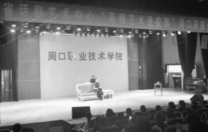 6月9日下午,由河南省教育廳、文化廳、財政廳主辦的2015年“高雅藝術進校園”——省話劇藝術中心專場演出在周口職業(yè)技術學院礪德廳舉行。激情的舞臺對白、絢麗的歌舞場景,話劇藝術中心的演員們聯(lián)袂為800余名師生獻上了一場視聽盛宴。(孫先鋒 攝)