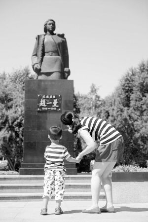 7月5日,在哈爾濱東北烈士紀(jì)念館旁的烈士廣場(chǎng),一名母親為孩子講述民族英雄趙一曼的英勇事跡。在“七七事變”紀(jì)念日即將到來之際,眾多游客來到哈爾濱東北烈士紀(jì)念館參觀,接受愛國(guó)主義教育。右圖為一名訪客在哈爾濱東北烈士紀(jì)念館內(nèi)參觀記錄。新華社記者 王凱 攝