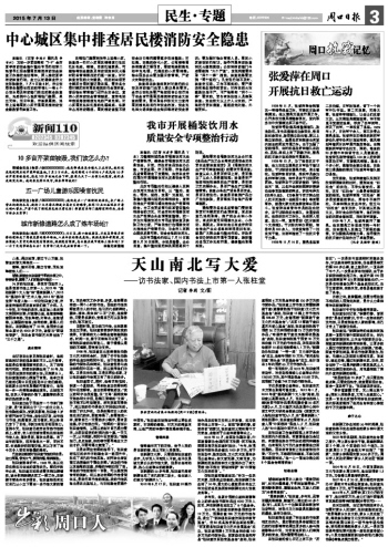 當(dāng)記者在北京見(jiàn)到張柱堂時(shí),他的容貌和記者的想象差別不大。從外表看,他就是位普通而慈祥的老人,見(jiàn)了誰(shuí)都笑呵呵的,即便在新疆生活了50年,張口還是地道流利的家鄉(xiāng)話。見(jiàn)到家鄉(xiāng)人,張柱堂激動(dòng)的心情溢于言表,他拿出自己做的《周口日?qǐng)?bào)》剪貼本讓我們翻閱,談起家鄉(xiāng)近年來(lái)取得的可喜變化,他都能一件一件清晰準(zhǔn)確地道來(lái)。此刻我方知,在老人平靜的外表下,蘊(yùn)藏著的是怎樣熾熱的家鄉(xiāng)情。