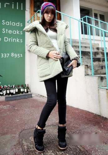 淡綠色羽絨服,大口袋的設(shè)計美觀又實(shí)用,彩色的毛線帽會讓冬季裝扮更顯活潑,黑色緊身與休閑高幫靴,休閑的裝扮也能充滿女人味。