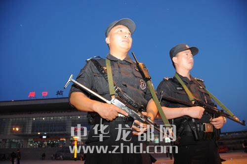 全副武裝的武警在汽車(chē)站巡邏
