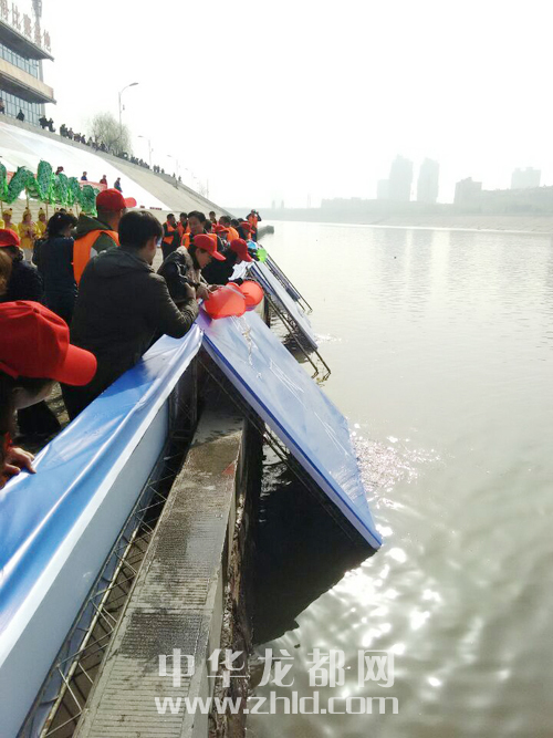3月21日,市民將魚苗投放進(jìn)沙潁河