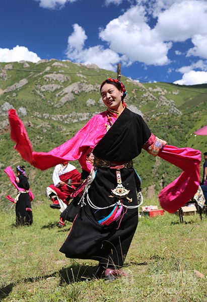 ????囊謙卓根瑪流傳于青海省玉樹藏族自治州囊謙縣,根據(jù)地理位置等可以分為囊謙南部林區(qū)卓根瑪和東部農(nóng)區(qū)卓根瑪,其風(fēng)格大同小異,南部林區(qū)卓根瑪分布在吉曲鄉(xiāng)、白扎鄉(xiāng),東部農(nóng)區(qū)卓根瑪分布在香達(dá)鎮(zhèn)、覺拉鄉(xiāng)。李鈺瑩/攝