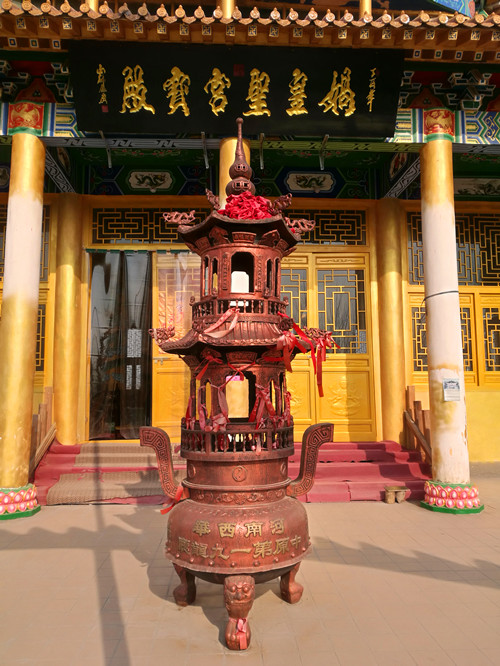 站在昆山女媧宮前向南看,一座高大宏偉的建筑物映入記者眼簾,由于它坐北朝南,我們只能看到它的背影。趙俊明告訴我們,那棟建筑物也是一座敬奉女媧娘娘的大殿,叫做媧皇圣宮寶殿。它是由一位女香客自發(fā)捐資修建的,這座氣派的大殿從無到有、從小到大整整用了14年時間,花費(fèi)近千萬元。