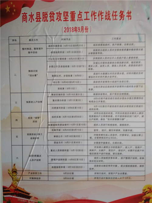 “‘脫貧攻堅重點工作作戰(zhàn)任務(wù)書’既是作戰(zhàn)圖、也是軍令狀,每個時間點開展哪些工作、達到什么效果、采取何種措施,都在‘作戰(zhàn)任務(wù)書’上顯現(xiàn)了出來?!?月5日上午,商水縣練集鎮(zhèn)朱集村脫貧責任組組長陳書敬指著張貼在村辦公室內(nèi)的“商水縣脫貧攻堅重點工作作戰(zhàn)任務(wù)書”說。
