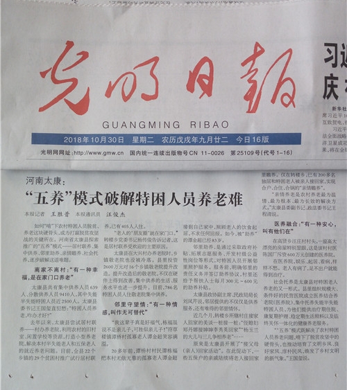 為助力脫貧攻堅,有效提高農(nóng)村特困老人整體供養(yǎng)水平,太康縣民政局、縣扶貧辦等部門在縣委、縣政府正確領(lǐng)導(dǎo)下,按照“一戶一策、一人一法”原則,創(chuàng)新實施集中供養(yǎng)、親情贍養(yǎng)、社會托養(yǎng)、居村聯(lián)養(yǎng)、鄰里助養(yǎng)“五養(yǎng)”模式,有效破解了特困老人的脫貧和養(yǎng)老難題。該做法經(jīng)《周口日報》率先報道后,國家級、省級媒體紛紛慕名前往太康采訪。截至目前,百余家媒體或網(wǎng)站相繼報道了太康“五養(yǎng)”模式。10月30日,《人民日報》《光明日報》分別以《養(yǎng)老,河南太康有了一攬子方案》《河南太康:“五養(yǎng)”模式破解特困人員養(yǎng)老難題》為題重磅介紹了太康“五養(yǎng)”模式經(jīng)驗。10月30日,人民日報海外版官方網(wǎng)站還以《河南太康:“五養(yǎng)”模式來了 特困人員笑了》為題作了報道。據(jù)了解,國家級3家主流媒體同一天內(nèi)報道同一工作經(jīng)驗,在太康縣宣傳史上尚屬首次。