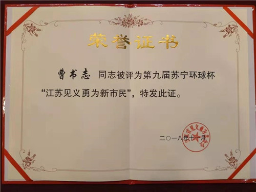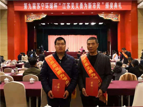 11月14日,江蘇省見義勇為基金會(huì)第九屆蘇寧環(huán)球杯“江蘇見義勇為新市民”頒獎(jiǎng)典禮在南京舉行,來自河南省項(xiàng)城市新橋鎮(zhèn)的農(nóng)民工曹書志獲此殊榮。