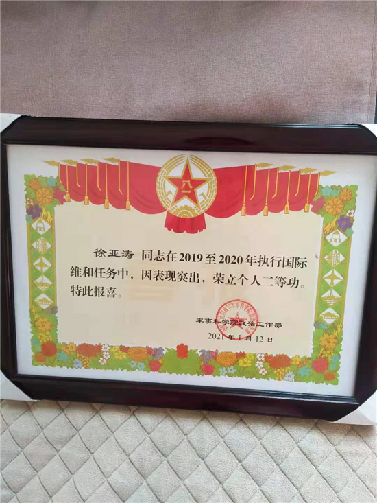 徐亞濤憑借出色表現(xiàn)獲得聯(lián)合國任務(wù)區(qū)的高度贊揚。中央軍委聯(lián)合參謀部也給予他“為聯(lián)合國任務(wù)區(qū)樹立了榜樣,是中國軍隊的杰出大使”的充分肯定。