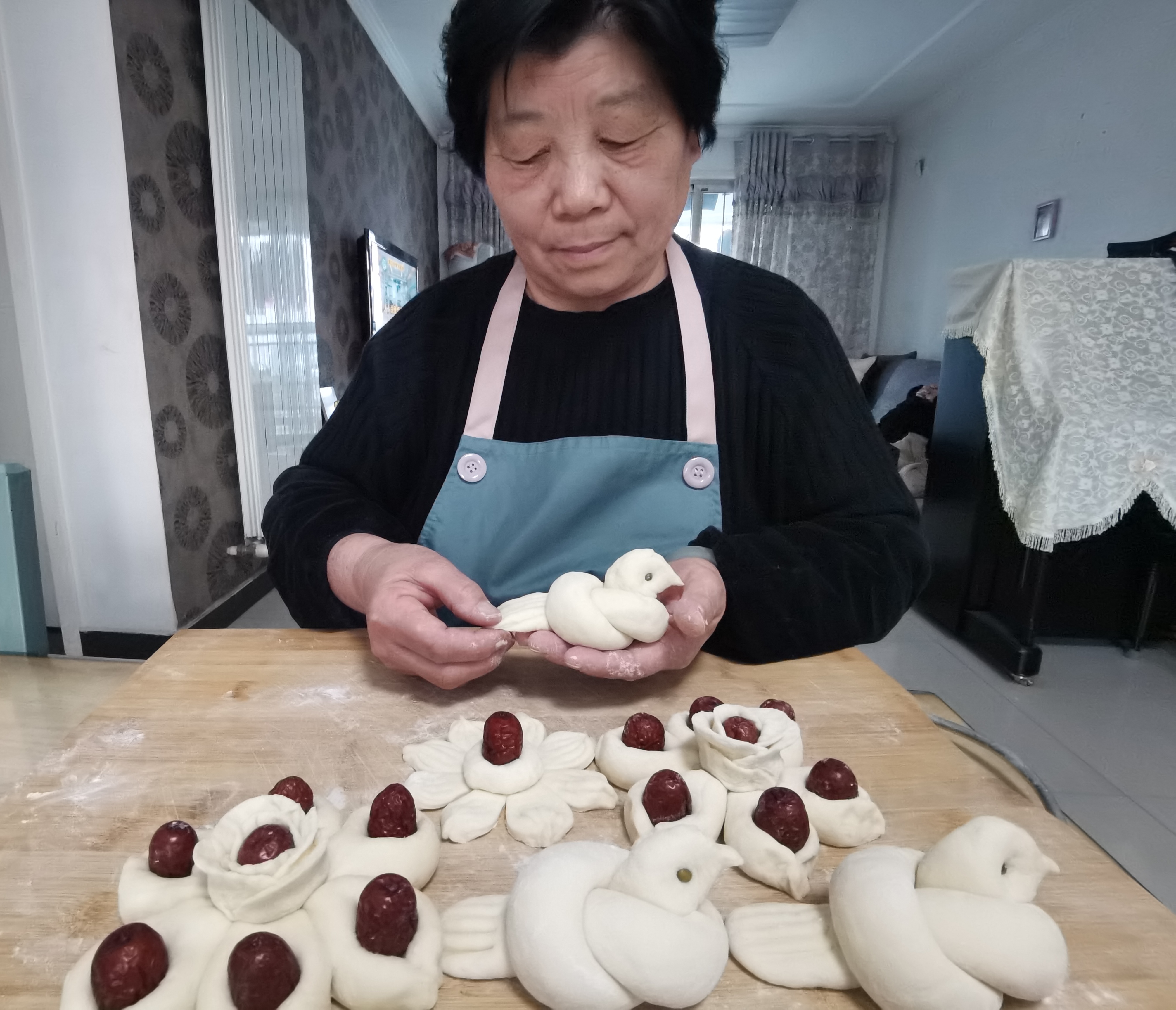 王大媽在蒸棗花饃,寓意著來年生活蒸蒸日上。