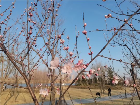 下午3點,陽光透著溫暖,許多市民在草地上或躺或坐,孩子們手里牽著風(fēng)箏,嬉笑追逐,幾株桃花被早春的氣息撞了一下,羞赧地開著,垂柳露著嫩綠的芽兒,在風(fēng)中舞動。
