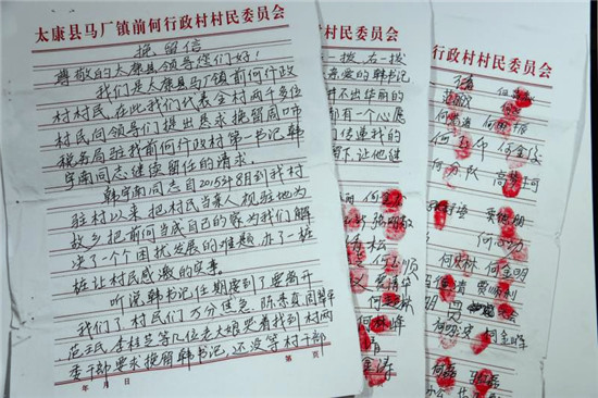 2018年,組織上考慮到韓宇南已經在第一書記的崗位上工作了3年多,決定換他回原單位工作。前何村的群眾聽到這個消息后,多次前往馬廠鎮(zhèn)政府請愿,要求留下韓宇南繼續(xù)擔任前河村支部書記,何心功等99位村民還向國家稅務總局周口市稅務局、太康縣委縣政府寫了一封“挽留信”,并按下了99個鮮紅的手印。