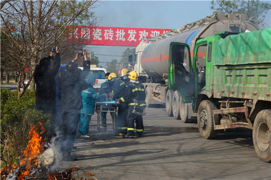 為進(jìn)一步健全完善涉及危險(xiǎn)品運(yùn)輸車事故應(yīng)急處置和搶險(xiǎn)救援機(jī)制,加強(qiáng)省際國省道安全管控,提高突發(fā)事件應(yīng)急處置和救援能力,經(jīng)共同研究決定,3月3日上午,河南省公安廳交警總隊(duì)組織周口市公安局交通管理支隊(duì)和安徽阜陽市公安局交通管理支隊(duì)聯(lián)合兩地交警、環(huán)保、消防、施救、120急救中心等多部門在兩市交界處舉行道路交通事故應(yīng)急救援聯(lián)合演練,演練內(nèi)容包括接處警、交通管制、環(huán)境監(jiān)測、營救被困人員、處置?;贰⑹鹿尸F(xiàn)場勘察、事故現(xiàn)場清理等內(nèi)容。